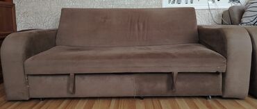 Ünvandan götürməQəhvəyi rəngli parçadan hazırlanmış bu divan-çarpayı rahatlıq və funksionallığı özündə birləşdirir. Yumşaq oturacaq və arxalıq hissələri ilə rahat istirahət təmin edir. Divanın alt hissəsində açılıb-bağlana bilən mexanizm sayəsində çarpayıya çevrilmə imkanı var. Bu xüsusiyyət onu qonaq otaqları və ya kiçik mənzillər üçün əlverişli edir. Yataq funksiyası gözlənilməz qonaqlar üçün əlavə yatacaq təmin edir. Divanın qəhvəyi rəngi bir çox interyer üslubuna uyğun gəlir və asanlıqla mövcud mebellərlə kombinə edilə bilər.Amerikanka sistemidi hem divanda, hemde kreslolarda