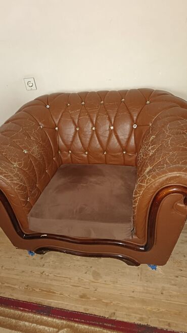 - Ölçülər (təxmini, şəkillərə əsasən): tək oturacaqlı kreslo; arxa fotoda uyğun üslubda 2–3 nəfərlik divan görünür.