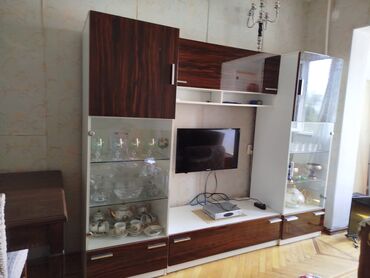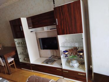 Televizor üçün nəzərdə tutulmuş bu qəhvəyi və ağ rəngli divar mebeli dəsti, müasir evlər üçün çoxfunksiyalı saxlama və nümayiş həlləri təklif edir. Dəst iki uzun, şaquli şkaf, bir mərkəzi televizor bölməsi və yuxarı asma şkafdan ibarətdir. Hər şaquli şkafın aşağı hissəsində qapalı saxlama sahəsi, yuxarı hissəsində isə şəffaf şüşə qapılı vitrin mövcuddur. Mərkəzi televizor bölməsi televizor üçün açıq sahəyə, aşağı hissədə geniş siyirməyə və yuxarıda bir neçə açıq rəfə malikdir. Bu dəst qonaq otağı və ya istirahət sahəsi üçün ideal bir əlavədir.İşlənmiş vəziyyətdədir.Köçlə əlaqədar olaraq təcili satılır.Real alıcılar maraqlana bilərlər.