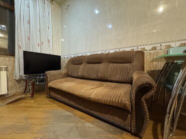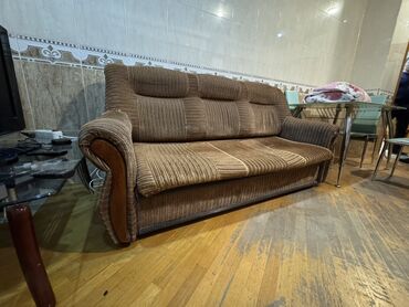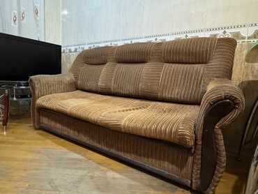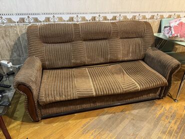 Qəhvəyi rəng çalarlarında, zolaqlı parça üzlü 3‑yerlik divan.