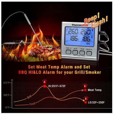 ● Ət Termometri təcrübəli və ya təcrübəsiz aşpaza ətin əsas temperaturunu yüksək qdəqiq və tez ölçməyə imkan verir. Qril termometri ikili sensor texnologiyasına malikdir və eyni vaxtda iki növ qidanı oxumaq üçün istifadə oluna bilən 2 paslanmayan polad zondla gəlir.