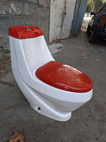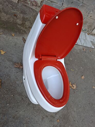 - Dizayn: Parlaq qırmızı qapaq və oturacaq, ağ keramika gövdə. Üst hissədə qırmızı su çəni ilə vahid monoblok konstruksiya.