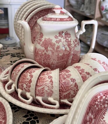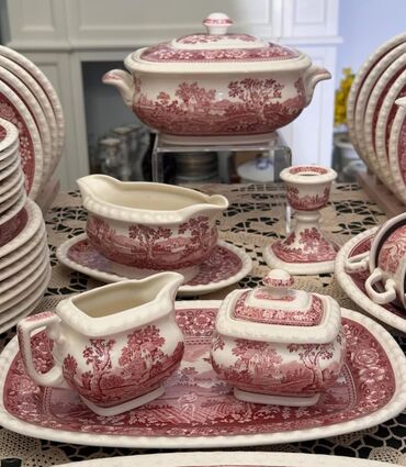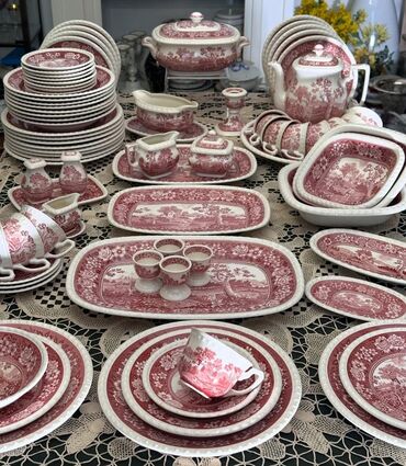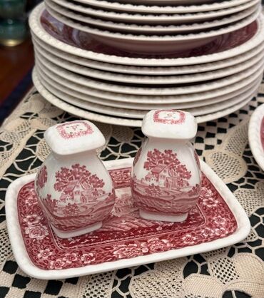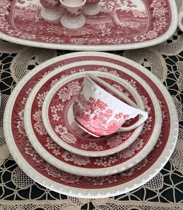 Klassik qırmızı-ağ naxışlı tam servis dəsti – İngilis üslublu pastoral motivlər və çiçək haşiyələri ilə.
