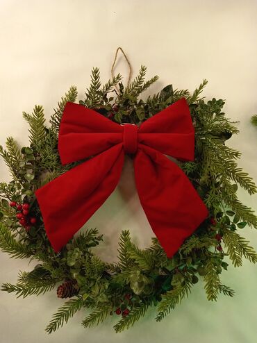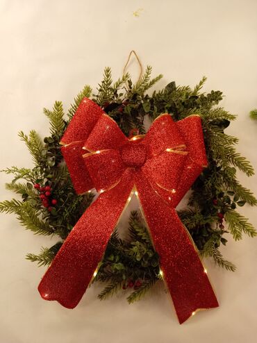 - Rənglər: yaşıl çələng, qırmızı bant və giləmeyvələr; LED-li variantda isti işıq effekti
