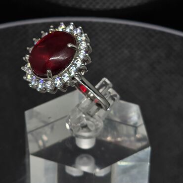 Gümüş 925 oval formalı, yaqut qasli qaşlı üzük. Üzüyün ətrafı dag bülluru, parlaq daşlarla bəzədilib. Zərif və eleqant görünüşü ilə xüsusi günlərdə və ya gündəlik istifadə üçün uyğundur.