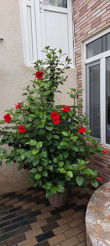 Qırmızı hibiskus (Çin qızılgülü) – iri, parlaq qırmızı çiçəkləri və sıx, tünd-yaşıl yarpaqları ilə dekorativ kol.