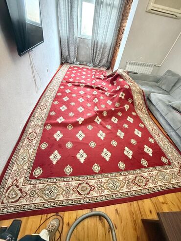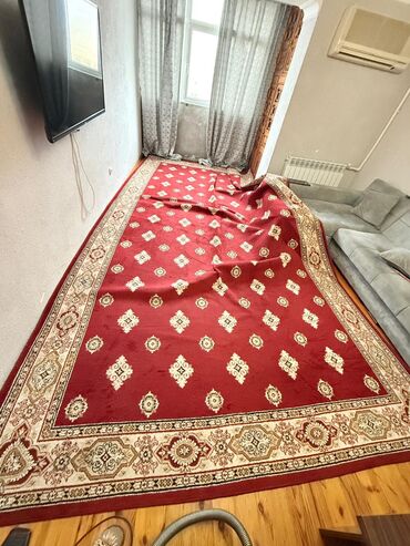 Xalça və yolluq dəsti - Klassik oriental naxışlı iri xalça: fonu tünd qırmızı, krem rəngli mərkəzi medalyon və haşiyələr, güllü ornamentlər. Otaq ölçülüdir, dördkünc forma. Kənar haşiyələr çoxzola...