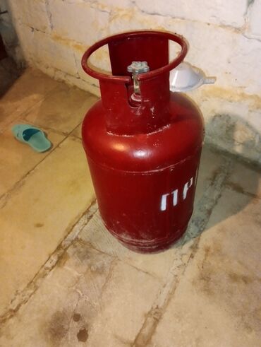 Propan qaz balonu - Rəng: qırmızı, üzərində “PROPAN” yazısı - Həcmi: iri tutum (təxmini 50 litr tipli məişət/propan balon ölçüsü) - Üst hissə: klapan, reduktor və çıxış burğu bağlantısı mövcuddur ...