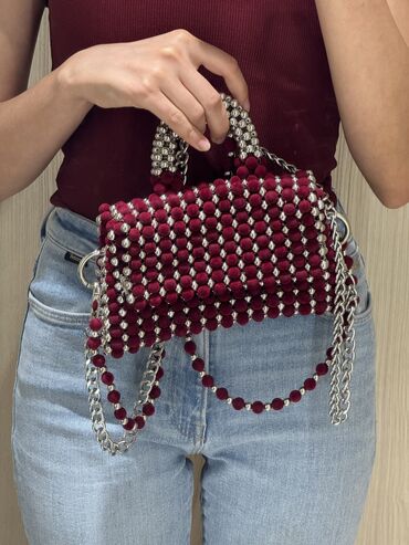 Gümüşü detallarla bəzədilmiş qırmızı rəngli muncuq çanta. Çanta hər iki tərəfində gümüşü halqalar və zincirlərlə təchiz edilmişdir. Əsas tutacaq da muncuqlarla bəzədilmişdir. Bu çanta həm gündəlik istifadə, həm də xüsusi tədbirlər üçün uyğundur.