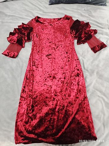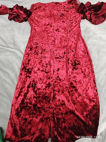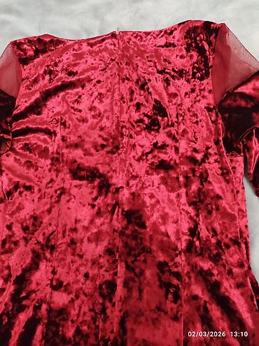 Qadın geyimi – iki rəngli şıq libas, bir dəfə geynilib təzədi - Üst hissə: canlı qırmızı şifon, dərin V yaxalı, örtməli (wrap) ön hissə, geniş yarasa qol. Qollarda və çiyinlərdə parlaq daş aplikas...