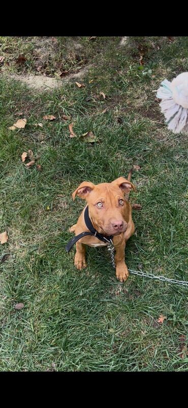 Amerikan Pitbull tipli (qısa tük, atletik bədənli) it. - Rəng: boz (blue/grey) – sinə və pənciklərdə ağ ləkələr - Boyunbağı: mavi - Qulaqlar dik, burun qısa, əzələli quruluş - Enerjili, oyaq və sah...