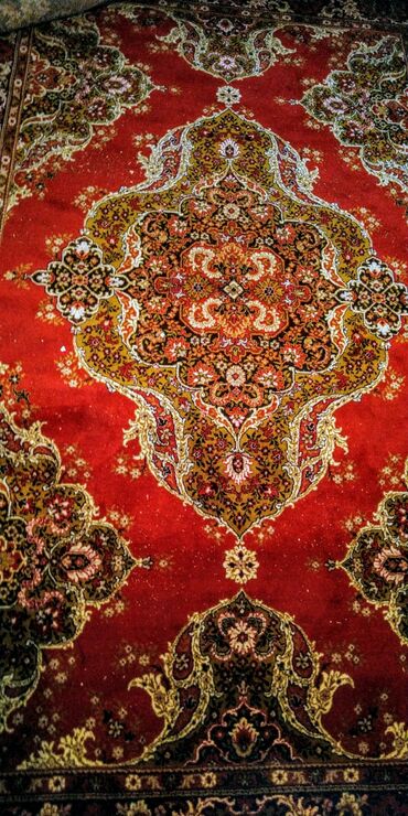 - Məhsul: Xalça - Ölçü: 2.30 × 3.50 m (şəkildə qeyd olunub) - Rəng və naxış: Bordo/qırmızı fon, mərkəzdə klassik şərq medalyon motivi; kənarlarda dekorativ haşiyələr. Ağ, qara, firuzəyi və krem ton...120 AZN