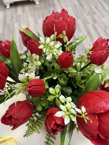 - Tərkib: realist fakturalı qırmızı süni lalələr, yaşıl yarpaqlar, fern və açıq rəngdə xırda dekorativ çiçəklər.