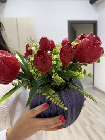 Dekorativ süni güllər kompozisiyası – qırmızı lalələr