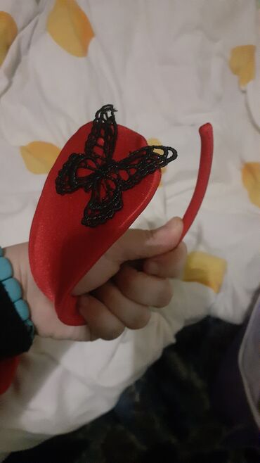 2) Qırmızı saç tacı – saten effekti olan parça ilə örtülmüş, üzərində qara krujeva kəpənək aplikasiyası. Yüngül və rahat, saçları sıxmayan konstruksiya.