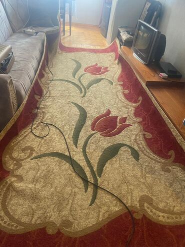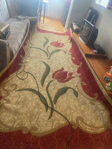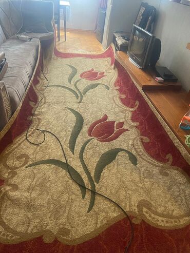 Qalın xalça – klassik floral naxışlı - Material: yumşaq, qalın tüklü toxuma (sintetik qarışıq) - Rəng palitrası: bej fon, yaşıl yarpaq və tünd qırmızı-gül çalarları, kənarlarda ornamentli haşiyə -...