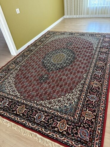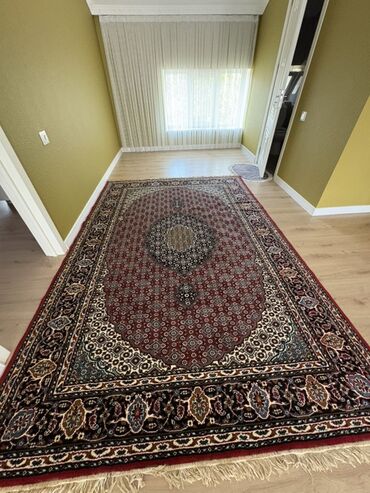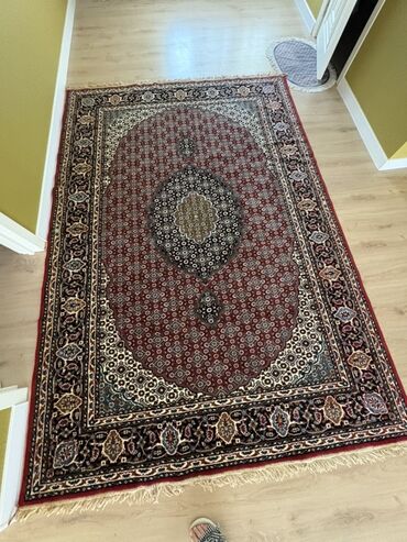 Qədimi xalça.Qırmızı tonlarda klassik şərq naxışlı xalça - Rənglər: əsas qırmızı fon, tünd bordo, bənövşəyi və açıq firuzə rəngli detallarla. - Dizayn: ortada iri medalyon kompozisiyası, ətrafında ...