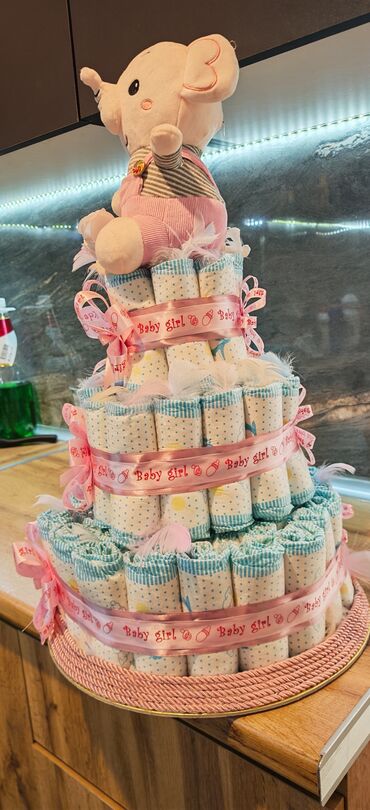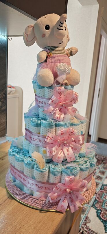 Üçmərtəbəli “diaper cake” – qız körpə üçün hədiyyə kompozisiyası.