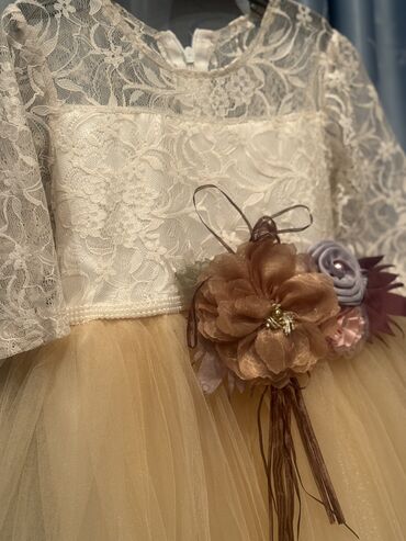 Zərif uşaq qız paltarı təzə - Rəng: krem/bej tonlarında - Naqış: incə barokko üslubunda relifli desen - Dizayn: qısa qollu, çiyinlərdə büzgülü volanlar - Ön hissədə dekorativ atlas bant və kiçik m...
