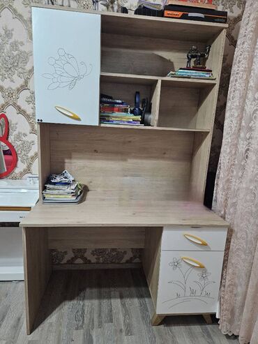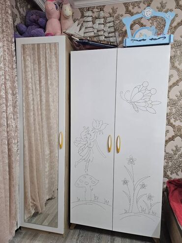 Uşaq/yeniyetmə otağı üçün mebel dəsti - Rəng: ağ-qırmızı kombinasiyası, dekorativ çiçək naxışları - Material: laminat/MDFlam tipli taxta, metal tutacaqlar, möhkəm menteşələr Dəst tərkibi: 1) İş m...