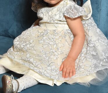 Uşaq üçün zərif ağ ziyafət/libas paltarı - Üst hissə: naxışlı qipür parça, qısa şişik qollar, arxada düyməli bağlanma - Bel hissəsi: atlas kəmər və ortada bej rəngli çiçək aplikasiyası ilə bəzək -...