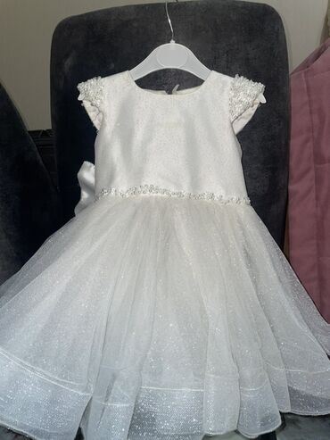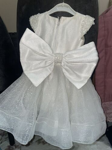 4-5 yas Qız uşaqları üçün ağ ziyafət/gecəlik paltar - Rəng: Qar bəyaz, nazik parıltılı örtük - Dizayn: Kvadrat yaxa, şiş qabarıq qısa qollar, bel hissəsində iri dekorativ bant (arxa tərəfdə bağla...