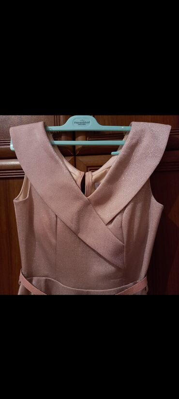 1) Pudra-çəhrayı rəngdə, parıltılı fakturalı, qolsuz və A-kəsimli paltar