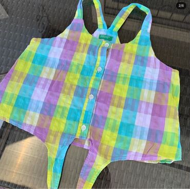 Benetton markalı, rəngarəng damalı naxışlı, ipək materialdan hazırlanmış qısa şort və üst hissədən ibarət dəst. Üst hissə düymələrlə bağlanır və ön tərəfdən bağlanmaq üçün ipləri var. Yay aylarında gəzintilər və istirahət üçün idealdır.......................................................