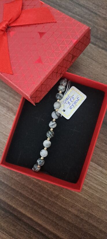 - Təbii görünüşlü boz-ağ naxışlı sferik muncuqlar, aralarında 585 prob qızıl bəndlər