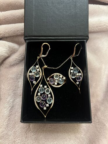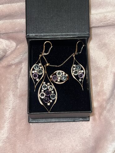 Zərgərlik dəsti – 5 parça, qutuda Tərkib: - Boyunbağı: Zərif zəncir boyunca baguette və dairəvi daşlı elementlər, mərkəzdə asqılı kompozisiya - Qolbaq: Boyunbağı ilə eyni naxışlı, klipsli bağlanma...