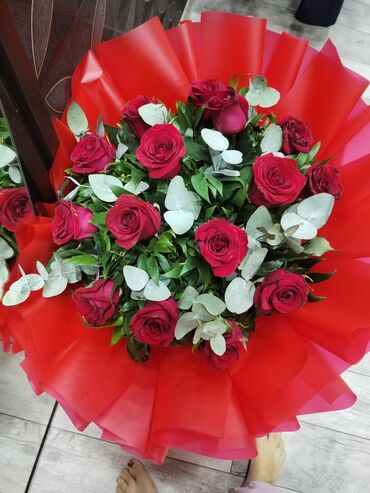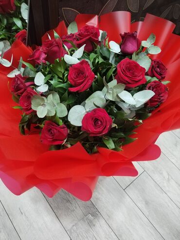 - Tərkibi: 15 ədəd tünd qırmızı qızılgül, eukalipt budaqları və parlaq yaşıl yarpaqlar
