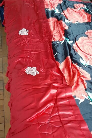 - Rəng: dərin qırmızı/bordo - Parça: parıltılı atlas effekti verən yumşaq material - Dizayn: qızılı-bej rəngdə zərif naxışlar – yarpaq, çiçək və girih motivləri; naxışlar boyunca incə bükümlü xət...