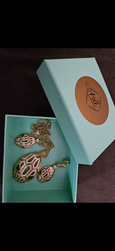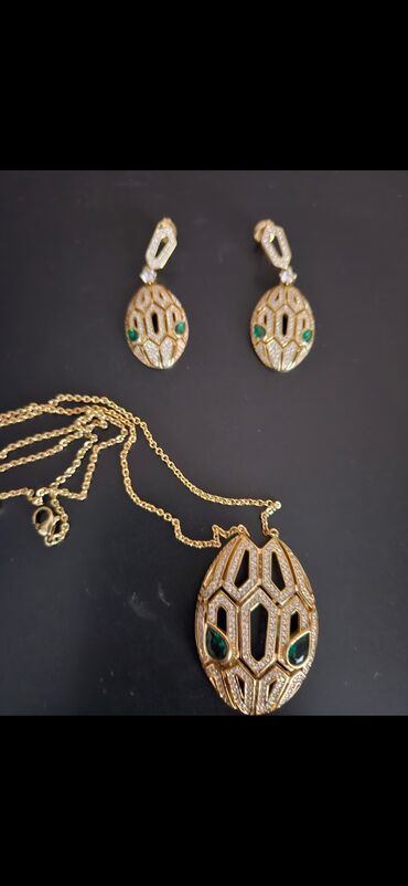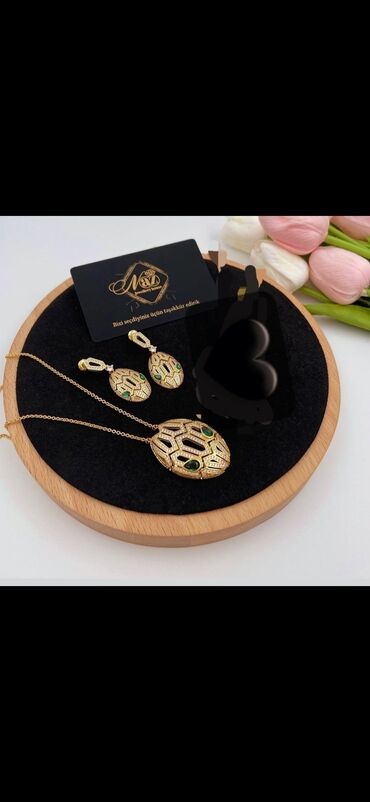 Zərgərlik dəsti və üzük - Dəst: boyunbağı və sırğalar - Dizayn: damla formalı yaşıl daş mərkəzdə, ətrafı şəffaf parlaq daşlarla haşiyələnmiş; daşın üzərində xırda gümüşü çiçək-zoğ naxışı - Boyunba...