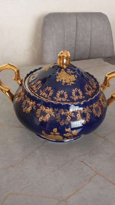 - Qapaqlı kaserol/süp qabı: iki tərəfli qulplu, qapaqlı, dərin gövdəli. Kobalt fon üzərində zəngin qızılı floral və girlyand naxışlar, qapaqda qızılı düymə. Süfrəyə servis və dekor üçün uyğundur.