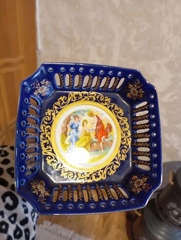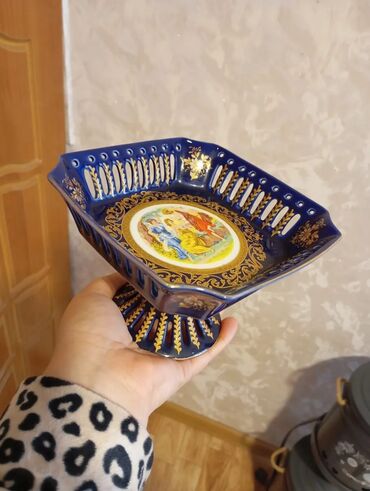 - Meyvə/qənnadı üçün ayaqlı vaz: kvadrat formalı, yanları perforasiyalı (şəbəkəli) dizayn, iç hissədə klassik tematik rəsm (medalyon) və ətrafında qızılı ornamentlər. Ayaq hissəsi də qızılı yarpaq motivləri ilə işlənib. Masa mərkəzi, süfrə bəzəyi və ya vitrin üçün ideal.