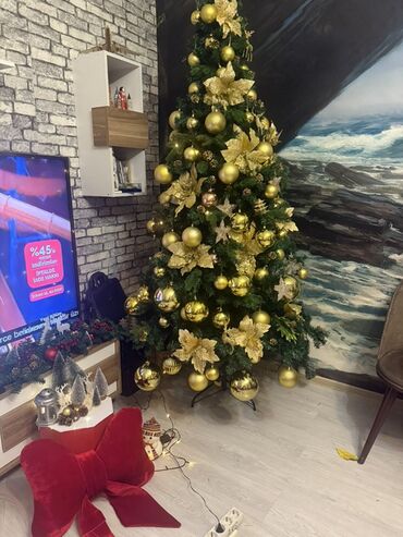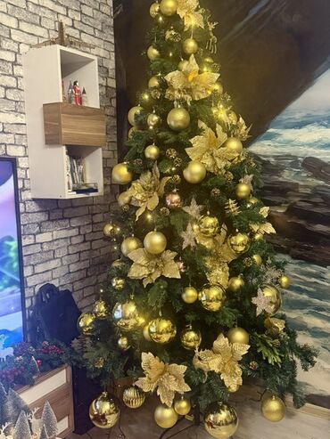 - Bəzəklər: qızılı rəngdə müxtəlif ölçülü şarlar (mat və parlaq), qızılı poinsettia/çiçək dekorları, şam qozaları, ulduz detallar