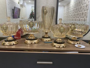 Qədimi üslubda bəzəkli şüşə dəstlər və vazalar 1) Qrafin və stəkan dəsti – 7 parça - 1 ədəd hündür qrafin (qızılı tonlarda, mat zolaqlı, relyef floral naxışlı) - 6 ədəd hündür stəkan - Hamısı eyni...