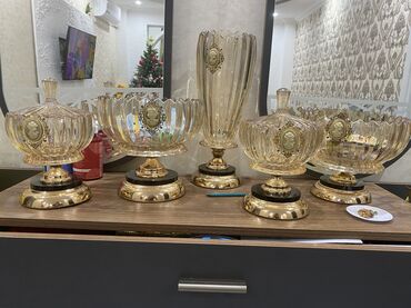 Dest seklınde Zərif şüşə və büllur qablar dəsti - Müxtəlif ölçülü dekorativ büllur qablar: dərin və dayaz kasalar, meyvə və salat üçün uyğun formalar - Qızılı və gümüşü naxışlı, ayaqlı dekorativ ...
