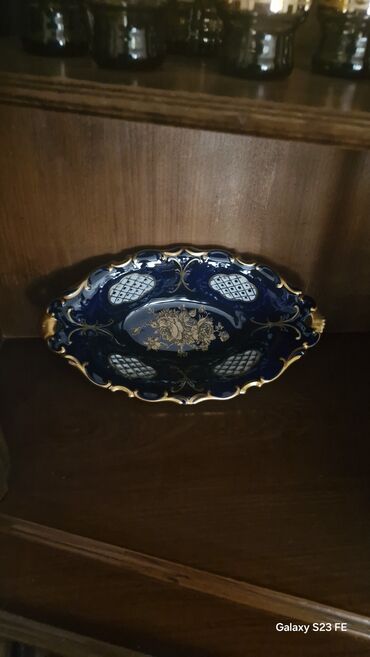 Bu oval formalı qab zərif dizaynı ilə seçilir. Tünd göy rəngdədir və qızılı naxışlarla, xüsusilə də qızılı güllərlə bəzədilmişdir. Qabın kənarları qızılı rəngli dalğalı haşiyəyə malikdir. İçərisində ağ rəngli damalı naxışlar qabın ümumi görünüşünə əlavə zəriflik qatır. Bu qab ev dekorasiyası üçün və ya şirniyyat, meyvə və digər qəlyanaltıların təqdimatı üçün istifadə edilə bilər. Klassik və zərif interyerlər üçün uyğundur.