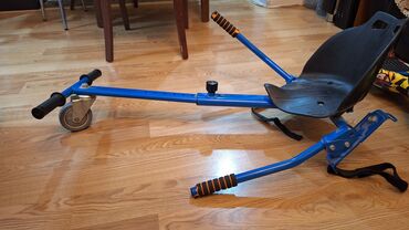 Qızılı rəngli iki təkərli hoverboard (self-balance skuter) və oturub sürmək üçün qoşqu, ayağ üstə sürə bilməyənlər üçün. İşlənmiş. - Parlaq qızılı korpus, hər iki tərəfdə rezin ayaqaltılar: sürüşm...