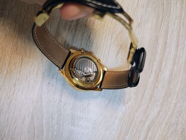 Kişi qol saatı - Korpus və qolbaq: paslanmayan poladdan, qızılı rəng örtüklü, parlaq cilalanmış metal qolbaq - Qapaq: dairəvi, nazik bezelli, sağ tərəfdə tənzimləmə düyməsi - Siferblat: skelet kon...