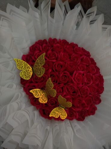 - Fotoşəkillərdə görülən elementlər buketlə birlikdə təqdim edilir (kəpənəklər və bəzək kağızı)