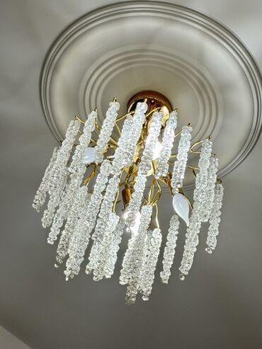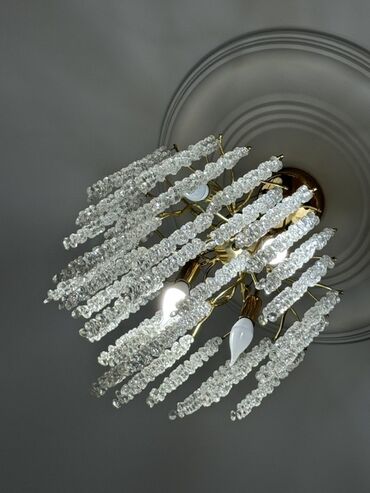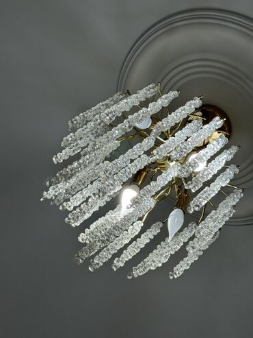 - Dizayn: Qızılı metal gövdə üzərində budaqvari qollar və çoxsaylı şəffaf kristal asqılar. Asqılar spiral/topçuq formalı elementlərdən yığılaraq “buz saçaqları” effekti yaradır, işığı çox istiqamətdə qırıb parıltı verir.