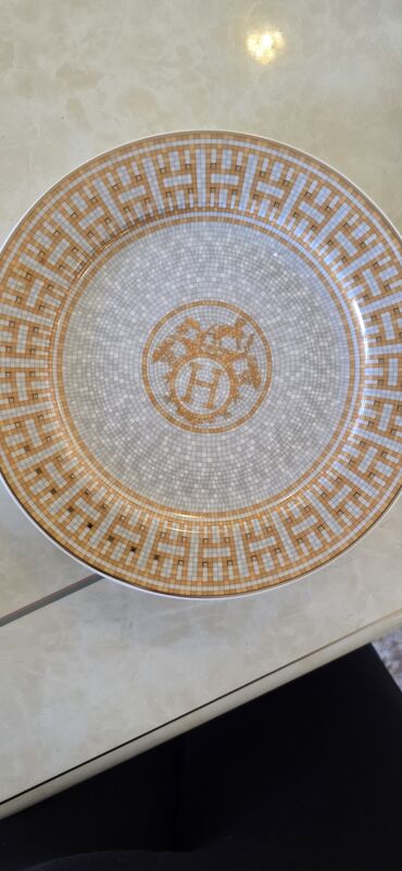 - Rəng və dizayn: ağ fon üzərində mozaika effekti; qızılı-şabalıdı rəngli haşiyə və mərkəzdə “H” emblemi ilə dekor
