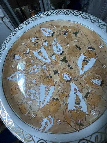 - Boşqab: geniş diametrli servis/ təqdimat boşqabı, kənar haşiyəsində spiral naxış, mərkəzdə koordinasiya olunmuş floral kompozisiya