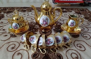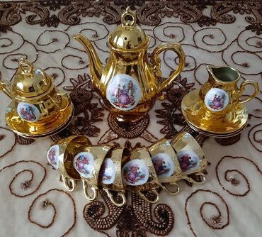Klassik üslublu qızılı çay dəsti - Material: yüksək keyfiyyətli porcelan, güclü qızılı örtük - Dekor: rokoko üslubunda pastoral səhnələr, relyefli kənarlar - Rənglər: parlaq qızılı və ağ, çoxrəngl...