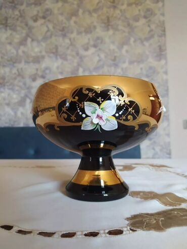 Qızılı haşiyəli şüşə/ XRUSTAL paslanmayan metal kombinasiyalı ayaqlı meyvə qabı - Material: qalın, kəsimli şəffaf ÇEXIYA ISTEHSALI XRUSTAL gövdə; qızılı rəngli metal halqalar (üst haşiyə, ara halq...