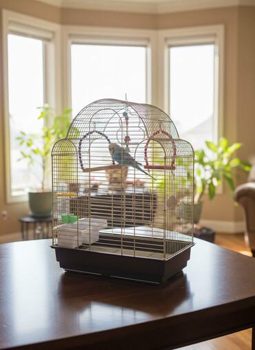 Metal qəfəs, quş saxlamaq üçün nəzərdə tutulub. Qəfəsin içərisində yem qabı, su qabı və oturacaq var. Kiçik quşlar üçün uyğundur.