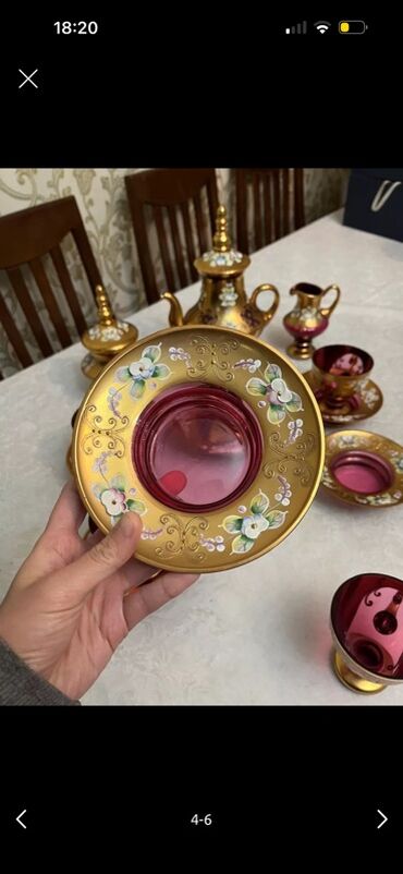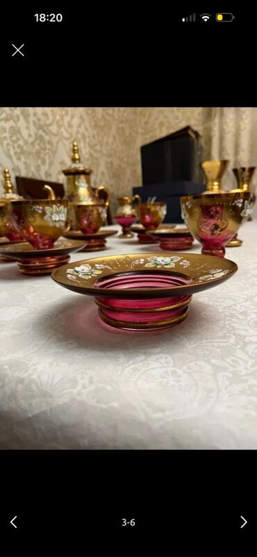 Qızılı-bordo rəng palitrasında, əl işləri ilə bəzədilmiş şüşə qəhvə/çay dəsti.