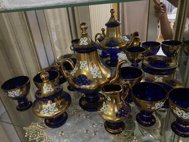 Bu dəstə şamdanlar, qəhvədan, çaydan, süd qabı, şəkər qabı, böyük boşqab, kiçik boşqablar və qədəhlər daxildir. Hər bir parça tünd göy rəngdə şüşədən hazırlanıb və üzərində qızılı naxışlar, ağ və bənövşəyi çiçək motivləri ilə bəzədilib. Dəst masaüstü dekorasiya və ya xüsusi günlər üçün istifadə oluna bilər.